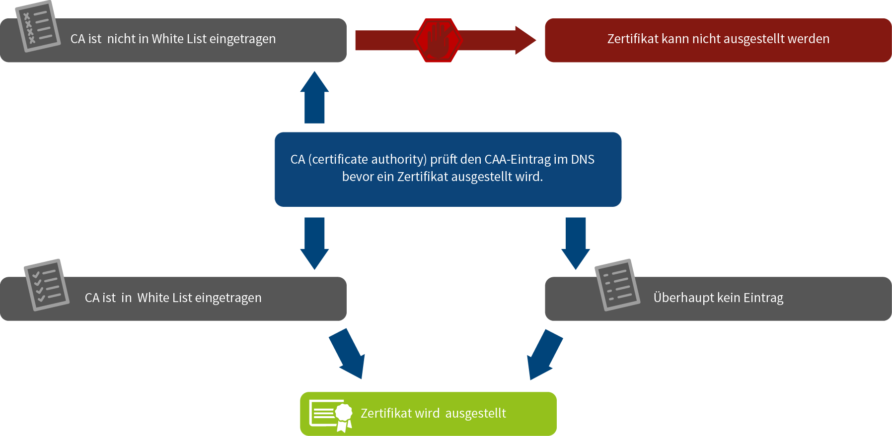 Schon in der DNS legen Sie als Domaininhaber mithilfe des CAA-Records fest, welche Zertifizierungsstelle ein Zertifikat für Ihre Domain ausstellen darf. Für diese Domain darf nun ausschließlich diese CA Zertifikate ausstellen. Es kann nicht mehr zu fälschlich ausgestellten Zertifikaten kommen.