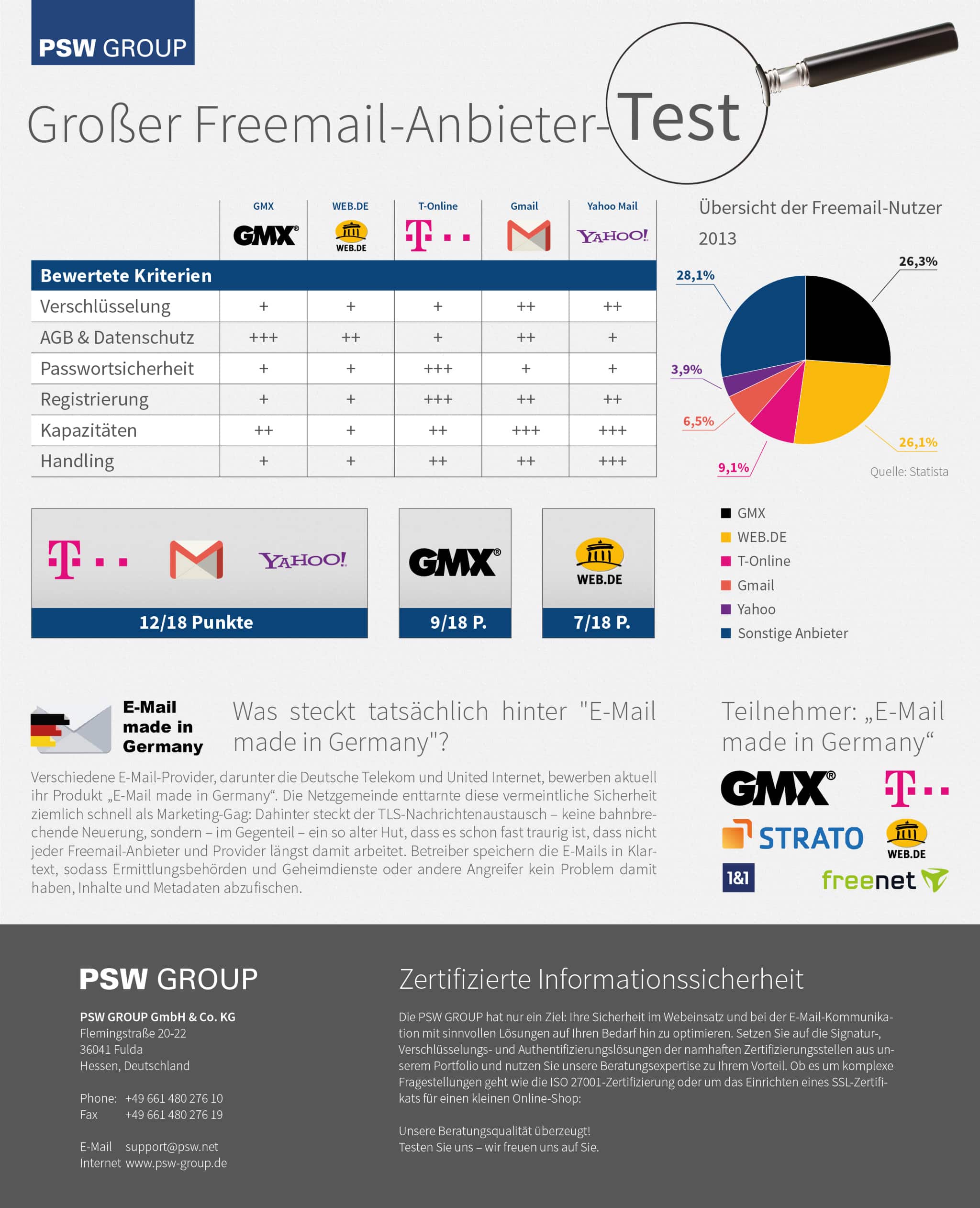 In den vergangenen Wochen haben wir fünf der beliebtesten Freemail-Anbieter ausführlich getestet: GMX, WEB.DE, T-Online, Gmail und Yahoo wurden auf ihre Sicherheit sowie Usability geprüft. In diesem Beitrag werden wir Ihnen eine ausführliche Übersicht liefern, mit deren Hilfe Sie, entsprechend Ihren persönlichen Bedürfnissen, einen geeigneten Freemail-Anbieter finden können.