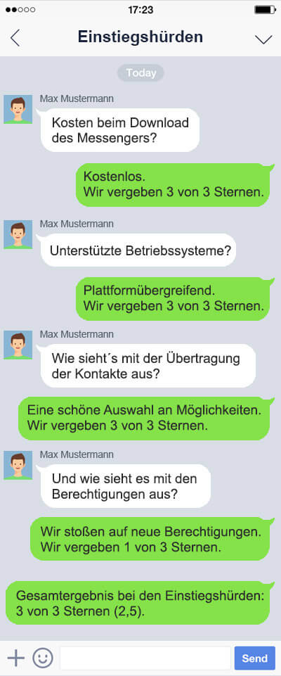 Die Einstiegshürden sind bei LINE gering geblieben: die kostenfreie App ist plattformübergreifend verfügbar, das Übertragen von Kontakten ist auf verschiedenen Wegen einfach möglich, jedoch verlangt die App viele Berechtigungen. Diese sind jedoch vollumfänglich mit der sehr breiten Funktionspalette erklärbar. Auch Bedienung und Zuverlässigkeit überzeugen.