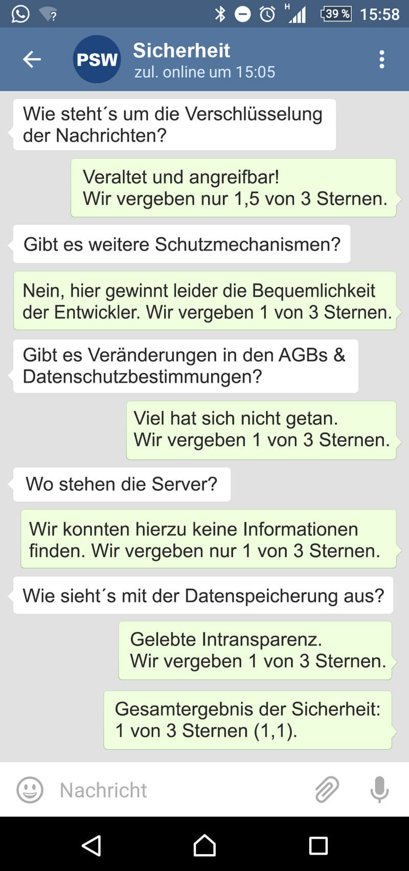 Die Feature-Liste ist bereits etwas umfangreicher als bei WhatsApp und Threema. Da wir jedoch wissen, dass bei anderen Messengern noch mehr kommen wird, vergeben wir 2,5 Sterne.
