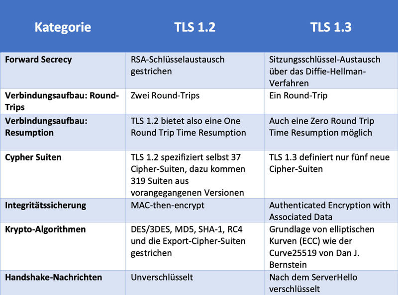 Schauen wir uns nun gemeinsam die wichtigsten Neuerungen an, die durch das Update auf TLS 1.3 die alten Sicherheitslücken schließen.