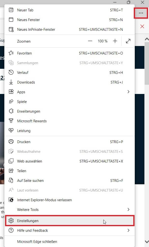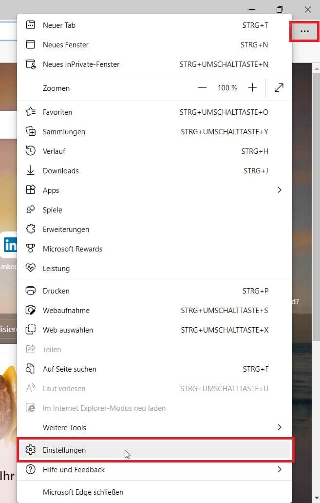 1. Öffnen Sie wieder die Einstellungen des Microsoft Edge über die drei Punkte oben rechts.