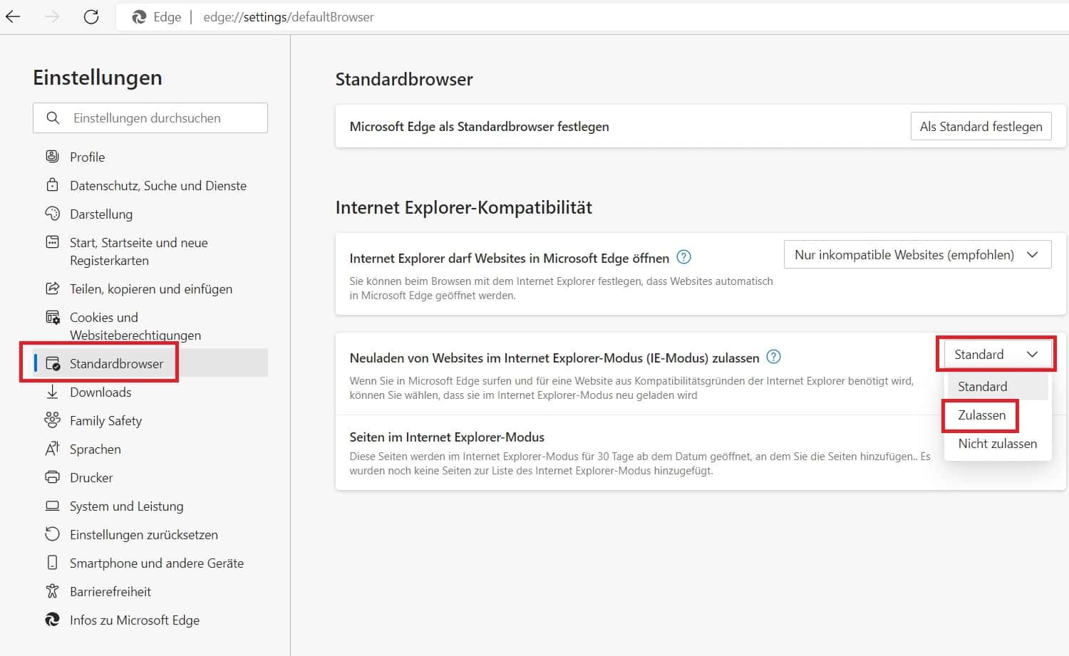 Wechseln Sie in den Reiter „Standardbrowser“ und setzen Sie dort, bei der Abfrage, ob der Internet Explorer Modus genutzt werden darf, die Einstellung auf „Zulassen“.