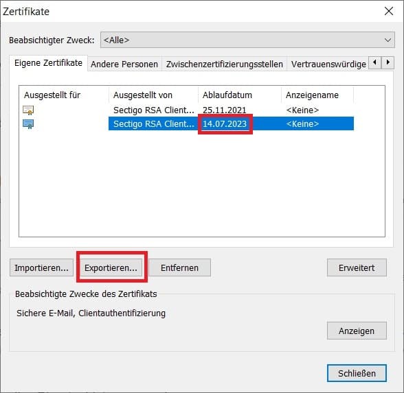 Wählen Sie das neue Zertifikat an und gehen Sie unten auf „Exportieren“.