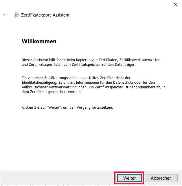 4. Dadurch startet sich ein Assistent um das Zertifikat zu exportieren. Bestätigen Sie den Assistenten mit einem Klick auf „Weiter“.