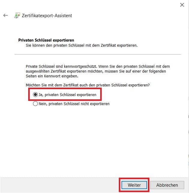 Wählen Sie hier „Ja, privaten Schlüssel exportieren“ und gehen Sie anschließend auf „Weiter“.