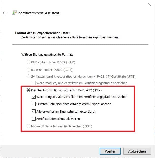Setzen Sie hier, wie unten ersichtlich, die folgenden Haken um das Zertifikat korrekt, nach Best Practice, zu exportieren.