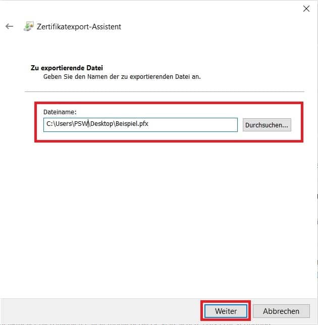 8. Nun dürfen Sie sich noch einen Ort und einen Dateinamen aussuchen. Speichern Sie das Zertifikat an einem sicheren Ort.
