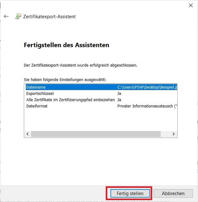 Schließen Sie den Export-Vorgang mit einem Klick auf „Fertig stellen“ ab.