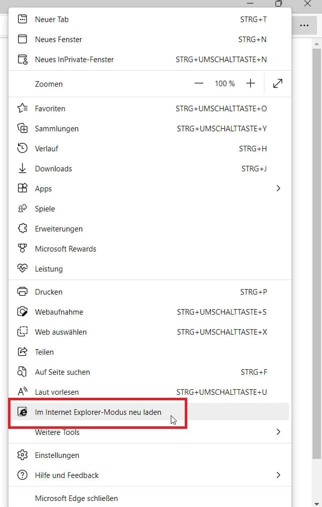 Wenn Sie den Browser neu gestartet haben, kann über die drei Punkte oben rechts der Internet Explorer Modus gestartet werden.