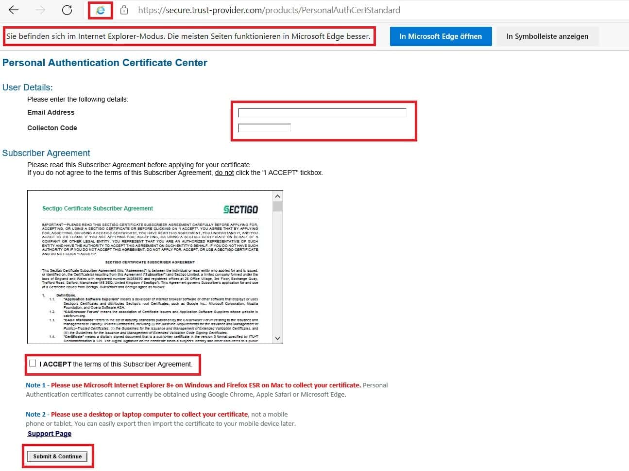 Setzen Sie abschließend noch den Haken für das Subscriber Agreement von Sectigo und klicken Sie auf „Submit & Continue“.