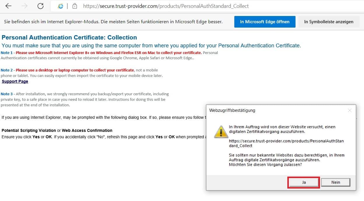 Erstellung des Zertifikates im Internet Explorer Modus des Microsoft Edge