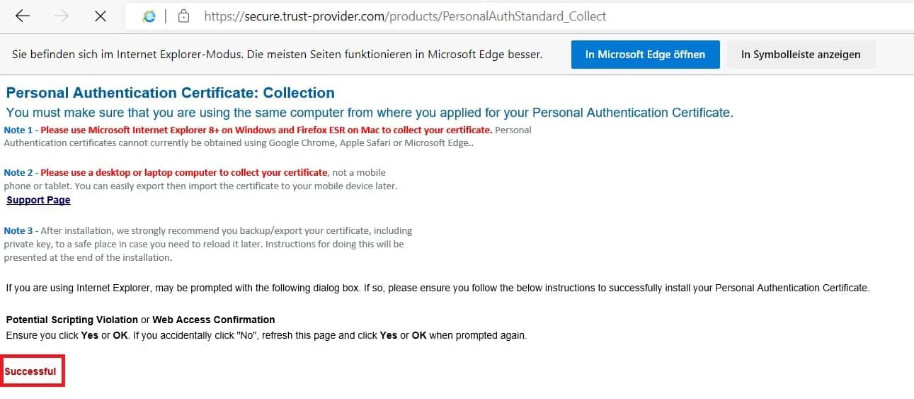 Wenn die Generierung des Zertifikates abgeschlossen ist, wird Ihnen ein „Successfull“ gemeldet und Sie werden automatisch auf die Support-Seite von Sectigo weitergeleitet.