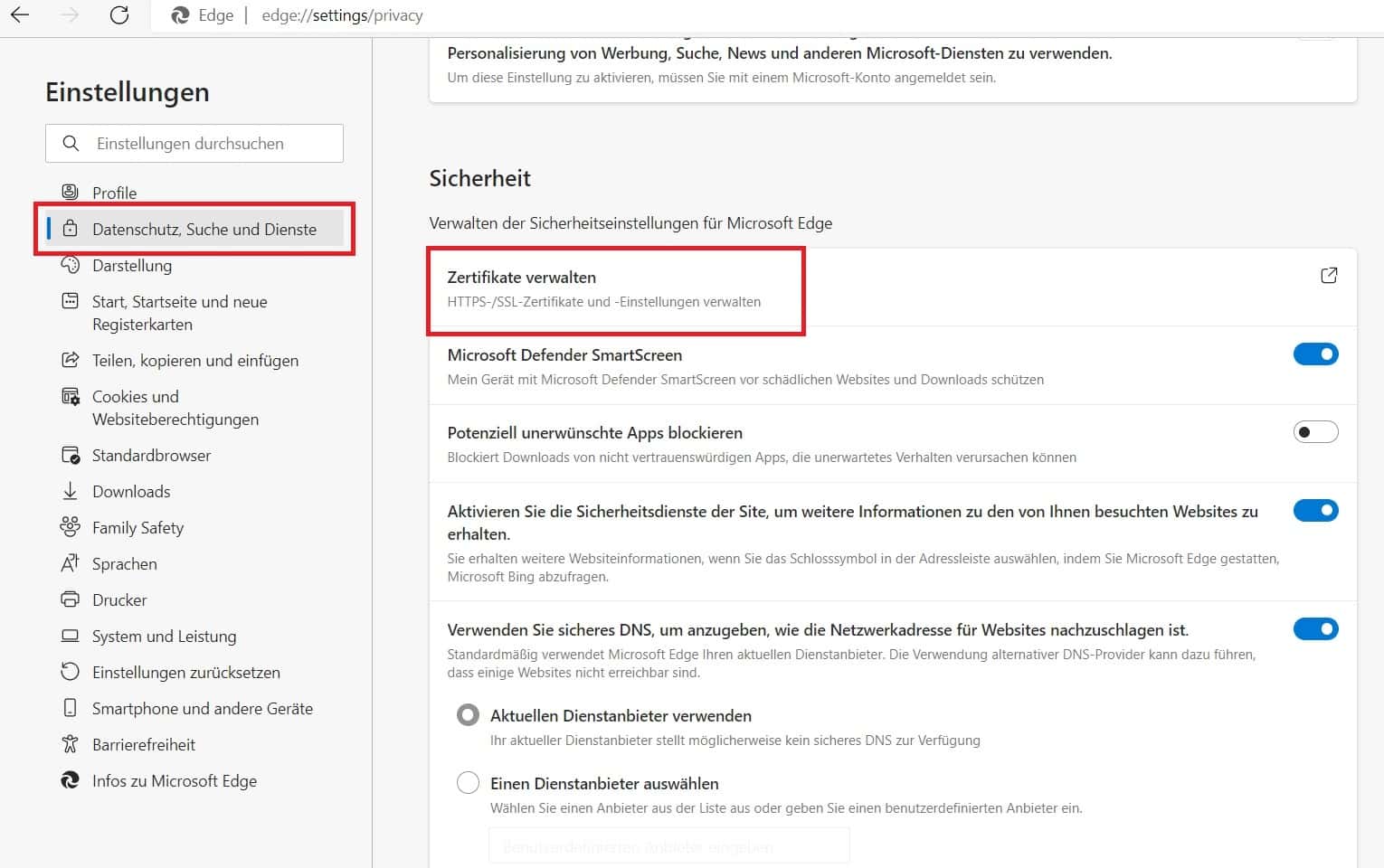 2. Wechseln Sie nun in den Reiter „Datenschutz, Suche und Dienste“ und öffnen Sie dort die Zertifikatsverwaltung über den Punkt „Zertifikate verwalten“.