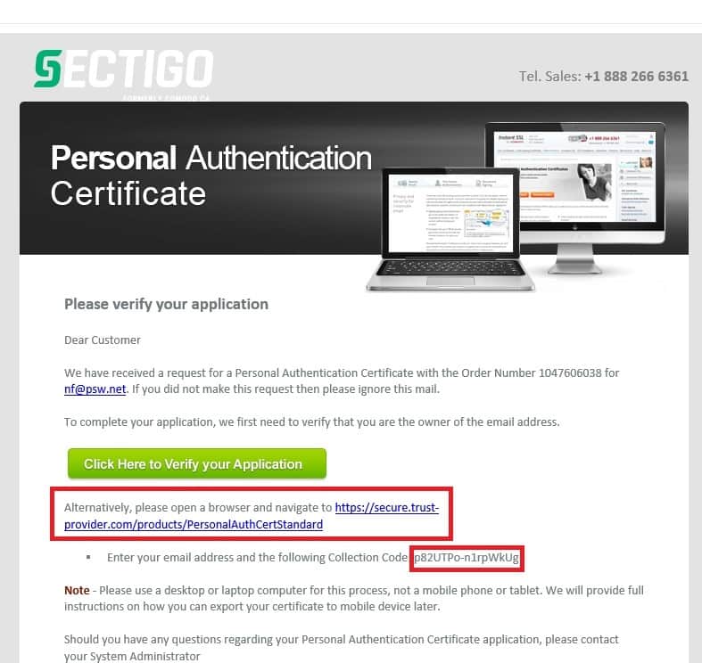 Die E-Mail von Sectigo, wo Sie den Validierungslink sowie den Collectioncode finden, sieht wie folgt aus.