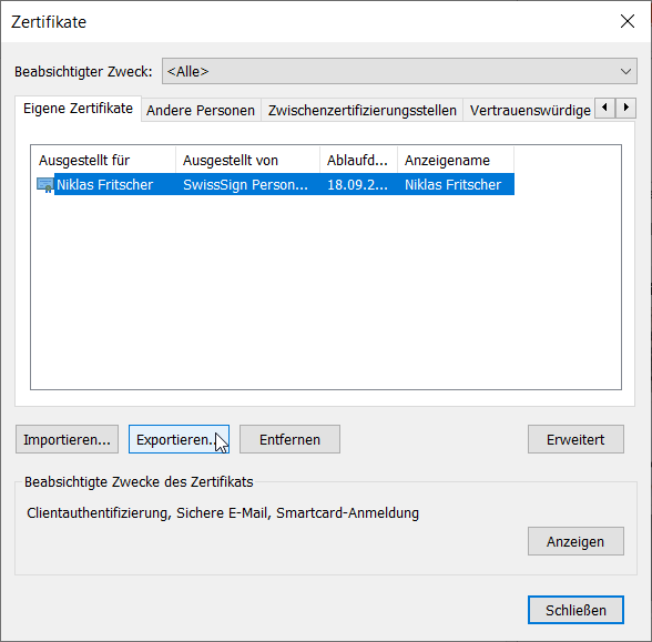 Browserexport von S/MIME und Code-Signing Zertifikaten