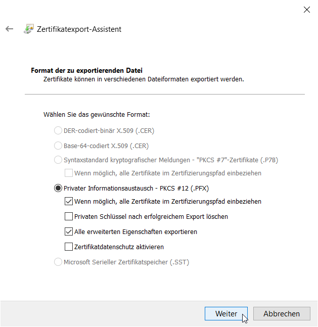Bei S/MIME-Zertifikaten und Code-Signing-Zertifikaten von Sectigo wird der private Schlüssel direkt über den Browser generiert. Diesbezüglich ist es bei diesen Zertifikaten zwingend notwendig, dass die erforderlichen Links der CA beim Kunden über den Internet Explorer bearbeitet werden. Wenn Sie die Links der CA erhalten und bearbeitet haben, wird das Zertifikat im Zertifikatsspeicher des Browsers hinterlegt, welchen er für den Vorgang verwendet hat. Damit ist der Vorgang abgeschlossen und das Zertifikat kann erfolgreich als PKCS12-Datei exportiert werden. Die üblichen Dateiendungen für dieses Format sind .pfx und .p12.