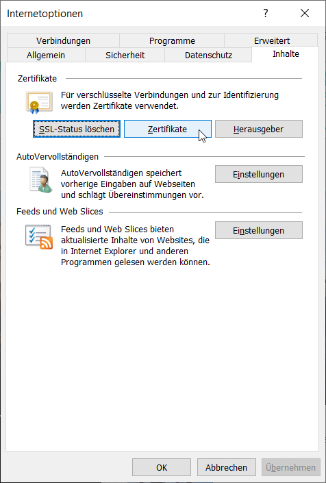 Internet Explorer → Extras→ Internetoptionen → Inhalte → Zertifikate → Zertifikat wählen → Sichern