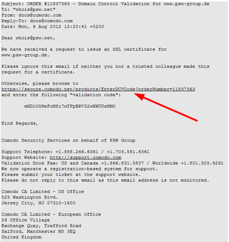 Haben Sie Comodo SSL-Zertifikate über unsere Webseite bestellt, erhalten Sie eine E-Mail mit der Sie den Domainbesitz validieren.