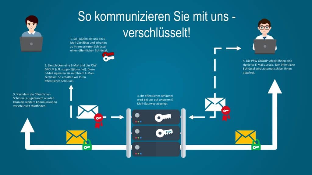 - Sie schicken eine E-Mail and die Managed IP (z.B. support@psw.net). Diese E-Mail signieren Sie mit Ihrem E-Mail-Zertifikat. So erhalten wir Ihren öffentlichen Schlüssel.