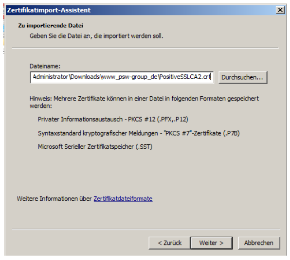 Wählen Sie das Ihnen zugesandte Zertifikat aus: