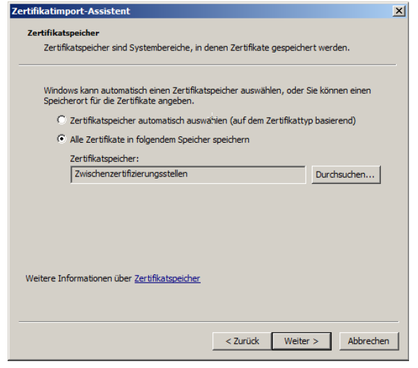 Sollte Ihr Zertifikat ein Zwischenzertifikat benötigen, so können Sie dieses mit der MMC einbinden.