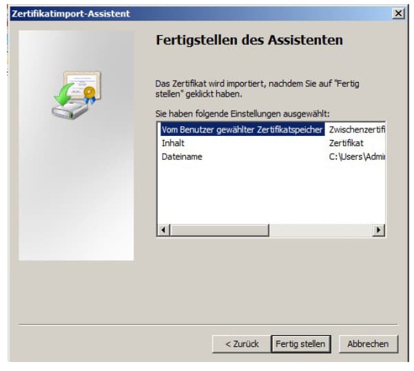 Beenden Sie mit einem Klick auf „Fertig stellen“ die Einspielung eines Zwischenzertifikates.