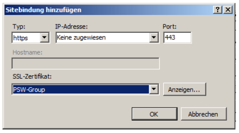 Wählen Sie als Bindungstyp „https“ aus und das entsprechende SSL-Zertifikat. Bestätigen Sie den Vorgang mit einem Klick auf „OK“.